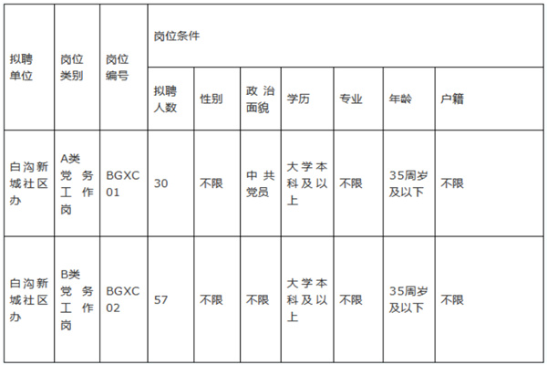 公开招聘专职社区工作者87名,其中A类党务工作岗位(含预备党员)30名,B类其他工作岗位57名(详见《白沟新城管委会2022年公开招聘专职社区工作者岗位表》)。