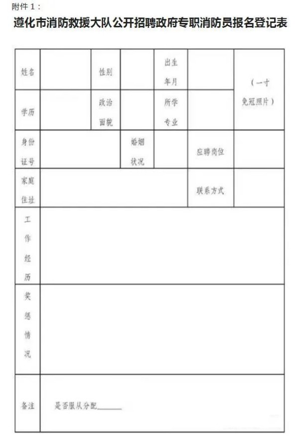 报名方法:填写报名表格(附件1)《遵化市消防救援大队公开招聘政府专职消防员报名登记表》送至遵化市南二环东路北侧遵化市消防救援大队。