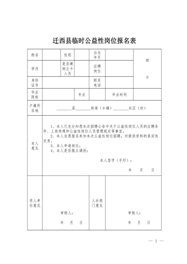 (二)现场报名所需资料。本次报名采用现场报名的方式,到县人社局就业服务中心东大厅6号窗口报名。填写《迁西县临时公益性岗位报名表》,贴近期、免冠、彩色、正面小2寸照片(艺术照除外),并提供身份证、毕业证、户口本等原件及复印件、就业创业证电子版编号(可到乡镇、街道或人社局就业服务中心2号窗口办理)。本人确保提供的个人信息和有关材料真实准确,对提供虚假信息和材料的,一经查实,即取消其资格。
