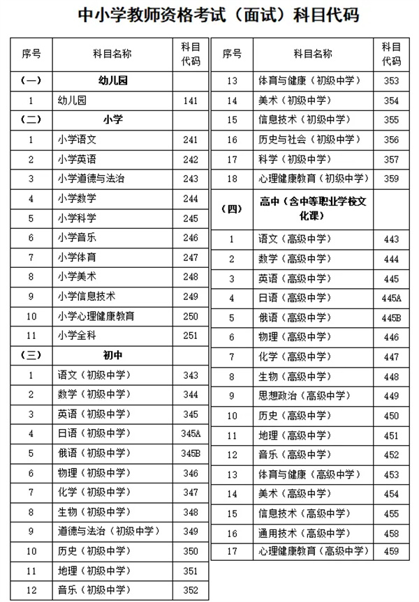 高中(含中等职业学校文化课)面试科目与笔试报考科目三(学科知识与教学能力)相一致,分17个科目:语文、数学、英语、物理、化学、生物、思想政治、历史、地理、体育与健康、音乐、美术、信息技术、通用技术、心理健康教育(新增)、日语(新增)、俄语(新增)。